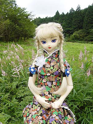 その少ないお花をバックに。 藍の背中ではミツバチさんがお仕事中でした。 「お花が少ないから大変そう…、頑張ってねミツバチさん。」 今日の服はmacoさんの作られたお洋服です。 ちょっとチャイナ風ですが、ツーピースで下はプリーツスカートになってます。 |